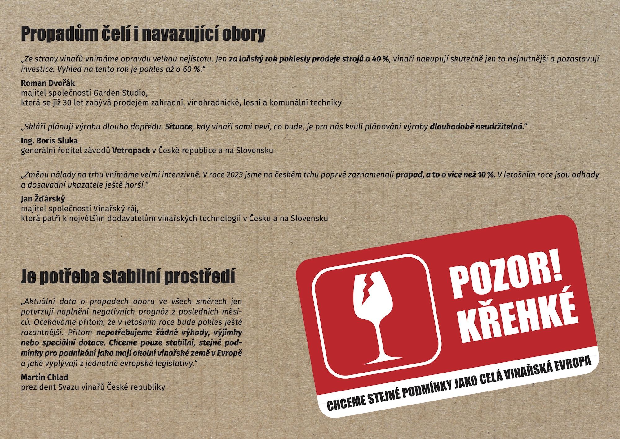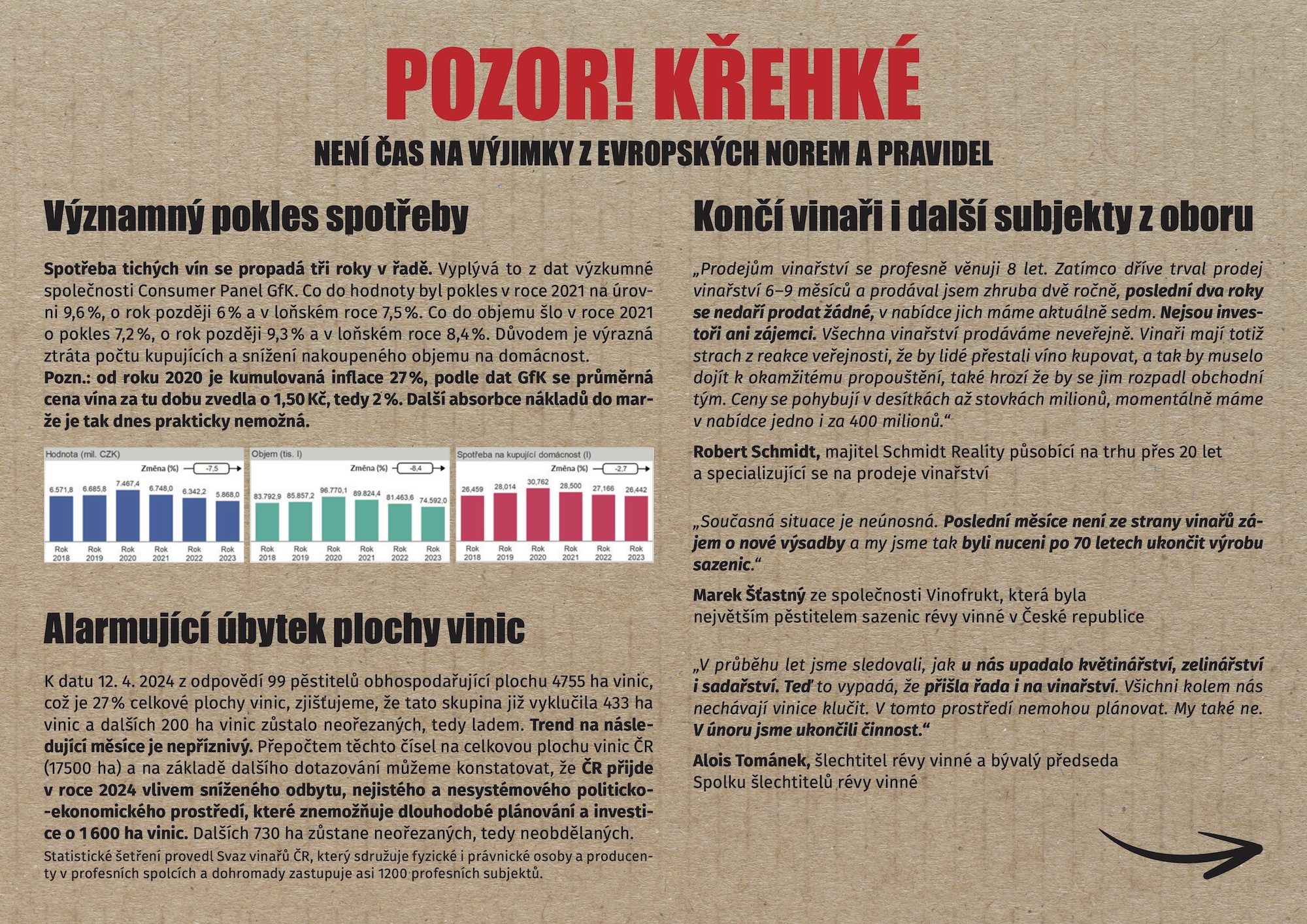 Vinařství v Evropě čelí celé řadě problémů. Vláda v České republice se nepochopitelně již více jak rok snaží zasadit domácím vinařům “bodnou ránu” v podobě zavedení spotřební daně. Vyzvali jsme proto lídra našeho regionu, hejtmana Jihomoravského kraje Mgr. Jana Grolicha, aby nás podpořil v několika bodech a řekl hlasité “NE” nesystémovým krokům, které jsou pro naše dlouhodobé řemeslo smrtelné. Chceme pouze stejné podmínky jako celá vinařská Evropa!
